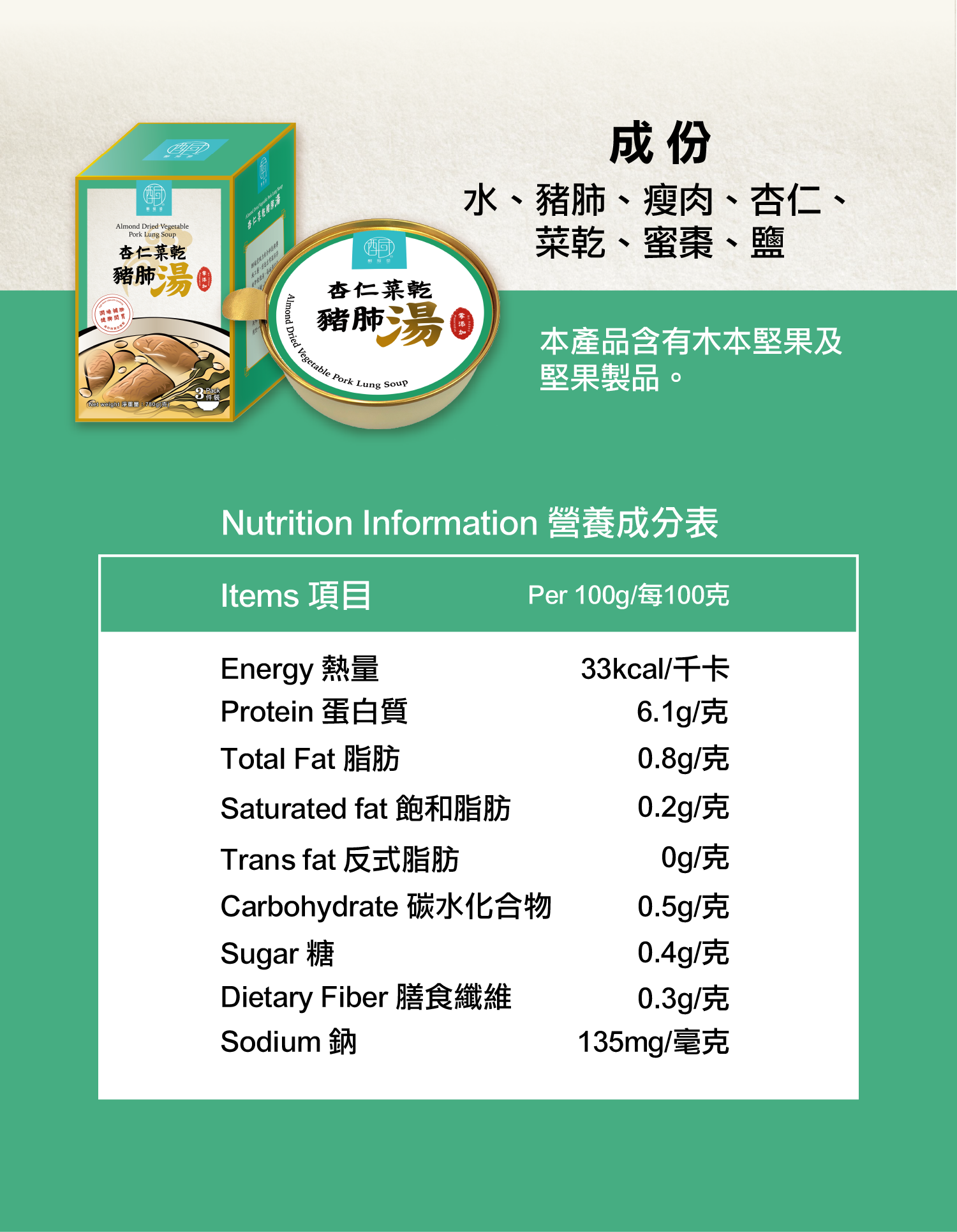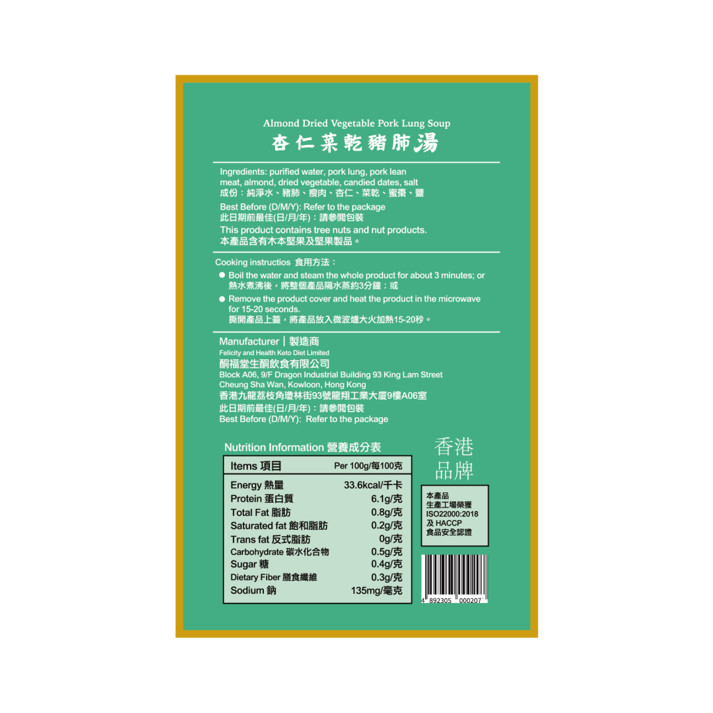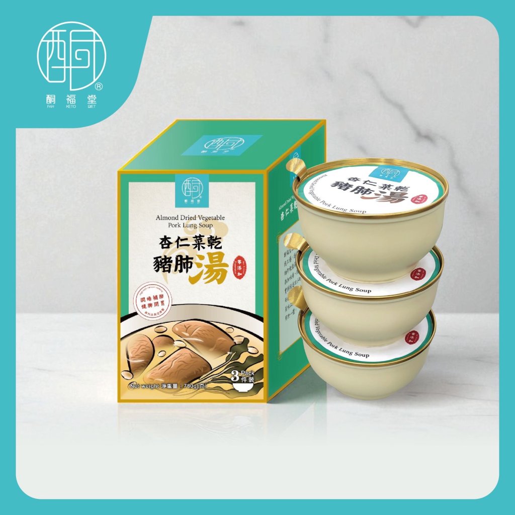 杏仁菜乾豬肺湯 - 豬肺能補肺虛、止咳嗽;南北杏搭配則兼具潤肺止咳與化痰平喘之效;菜乾清解肺胃熱氣;蜜棗和瘦肉健脾和中,並增添甘甜潤澤,使湯性平和。全湯共奏潤燥化痰、健脾益氣之功,尤其適合於秋冬季節或感冒後期,對抗乾燥天氣引起的咽喉不適與久咳不癒。酮福堂致力結合科技與傳統工藝,創造出常溫保存的即飲燉湯,每碗湯均無添加味精、防腐劑,真材實料經過四小時溫火燉製而成,結合天然、健康、美味以及隨時隨地輕鬆享用於一體。