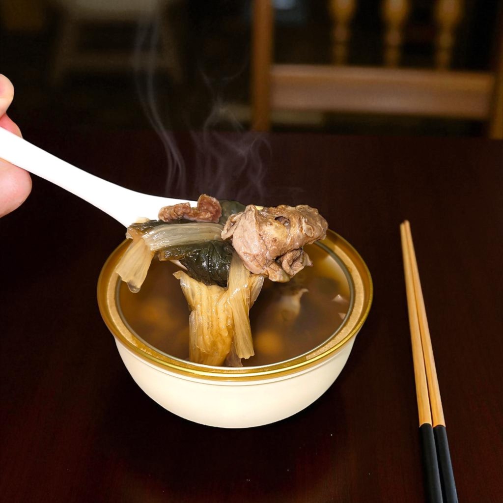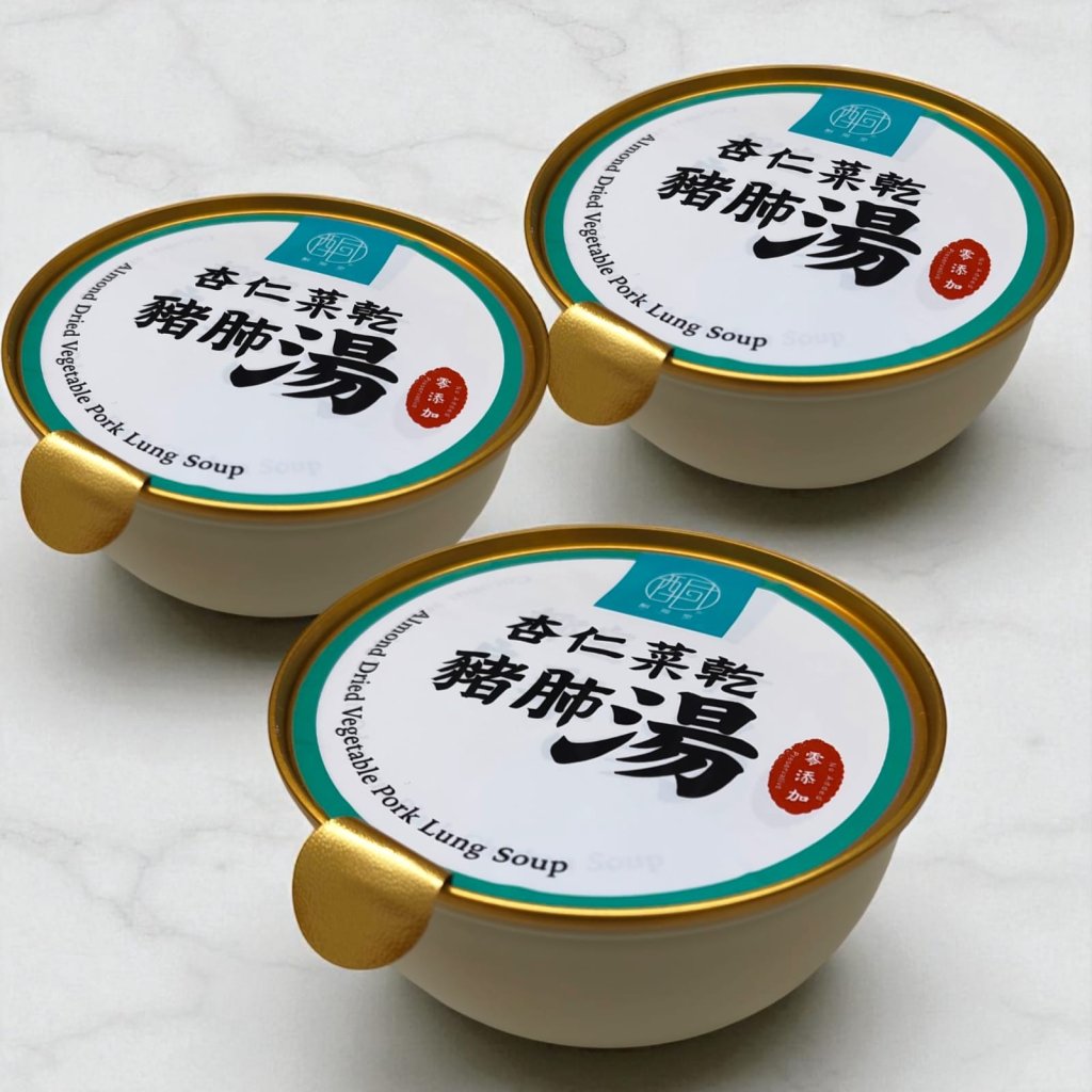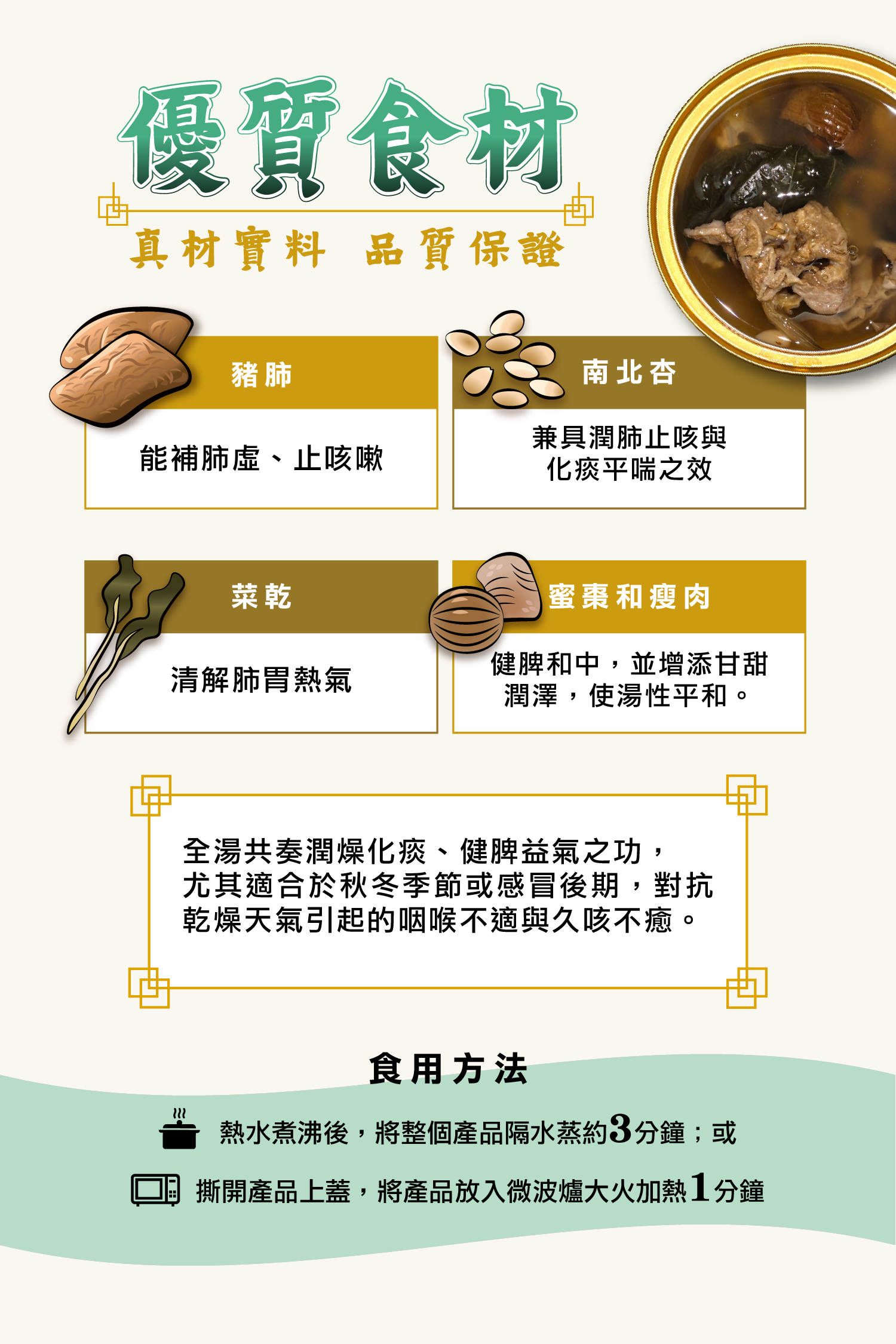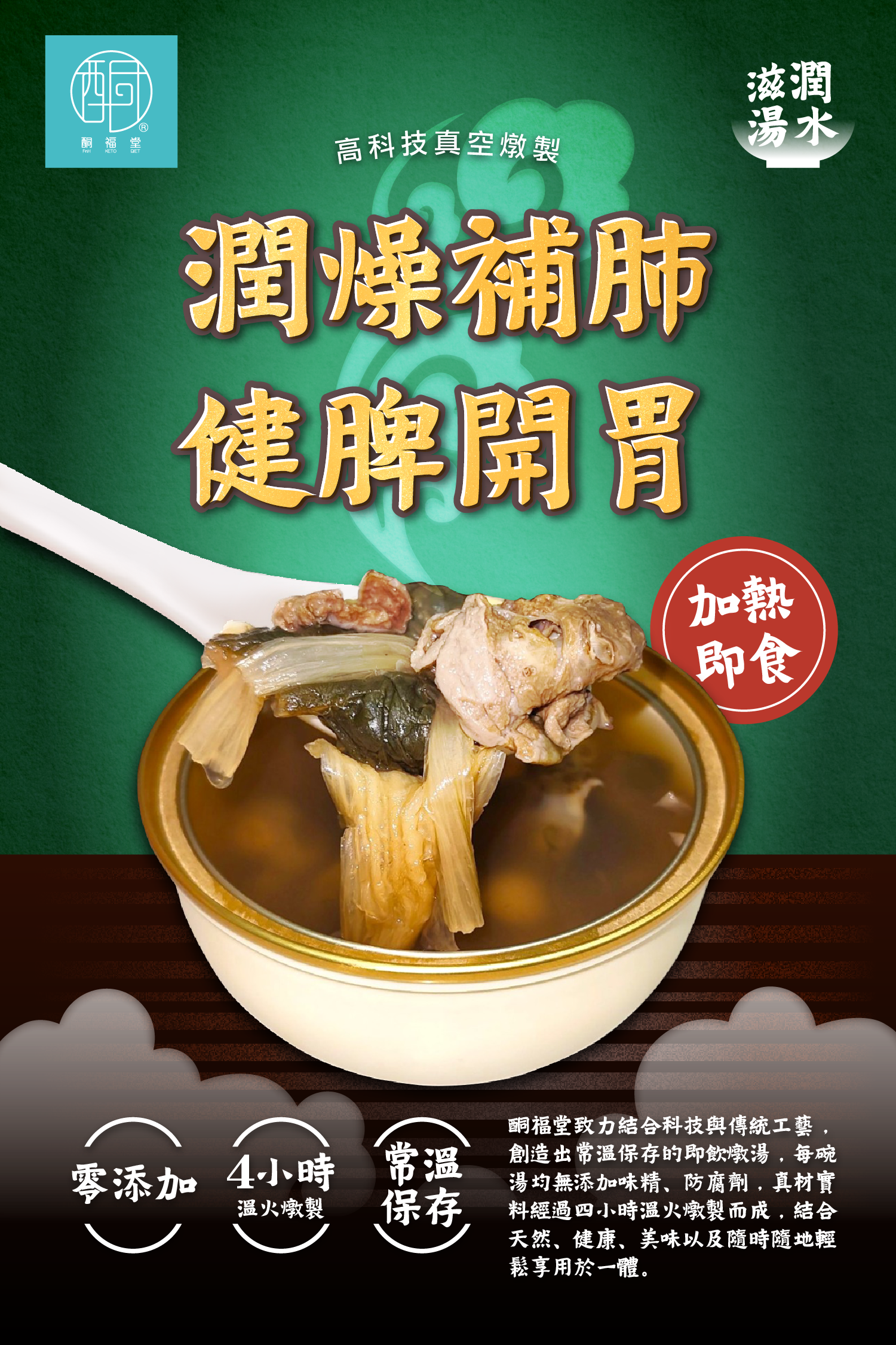 杏仁菜乾豬肺湯 - 豬肺能補肺虛、止咳嗽;南北杏搭配則兼具潤肺止咳與化痰平喘之效;菜乾清解肺胃熱氣;蜜棗和瘦肉健脾和中,並增添甘甜潤澤,使湯性平和。全湯共奏潤燥化痰、健脾益氣之功,尤其適合於秋冬季節或感冒後期,對抗乾燥天氣引起的咽喉不適與久咳不癒。酮福堂致力結合科技與傳統工藝,創造出常溫保存的即飲燉湯,每碗湯均無添加味精、防腐劑,真材實料經過四小時溫火燉製而成,結合天然、健康、美味以及隨時隨地輕鬆享用於一體。