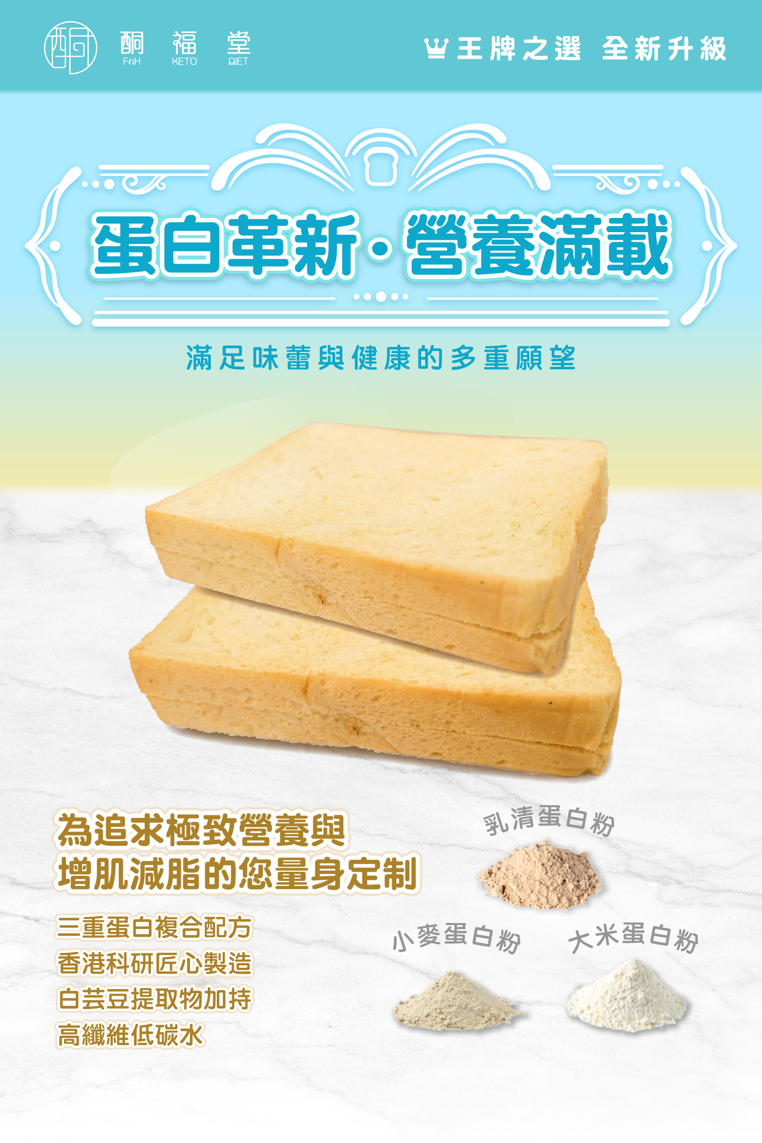 生酮方包創造健康新文化!低碳水、高蛋白,傳統小麥方 包的理想替代品。減少碳水化合物攝入,有效控制血糖波 動,同時提供豐富的蛋白質,增加飽腹感,有助於建立健美 體態。天然食材,營養豐富,提供大量膳食纖維,促進腸道 健康和增強免疫力。選擇生酮麵包,能享受美味又同時健康 瘦身,是新一代最營之選。