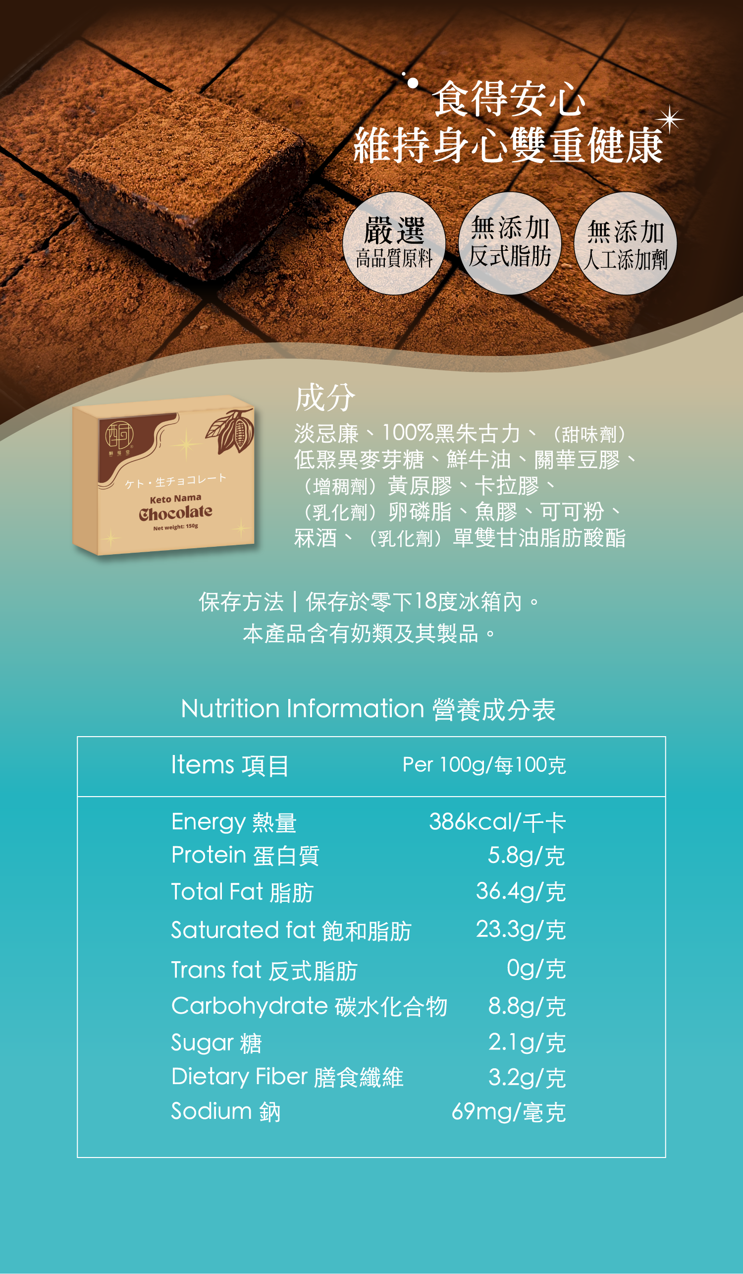 採用日式工藝製作,外層細滑,內芯柔軟濃郁。我們重現了生巧克力的細膩口感,同時做到無麩質、低碳水,並含有優質脂肪,讓您享受時更無負擔。