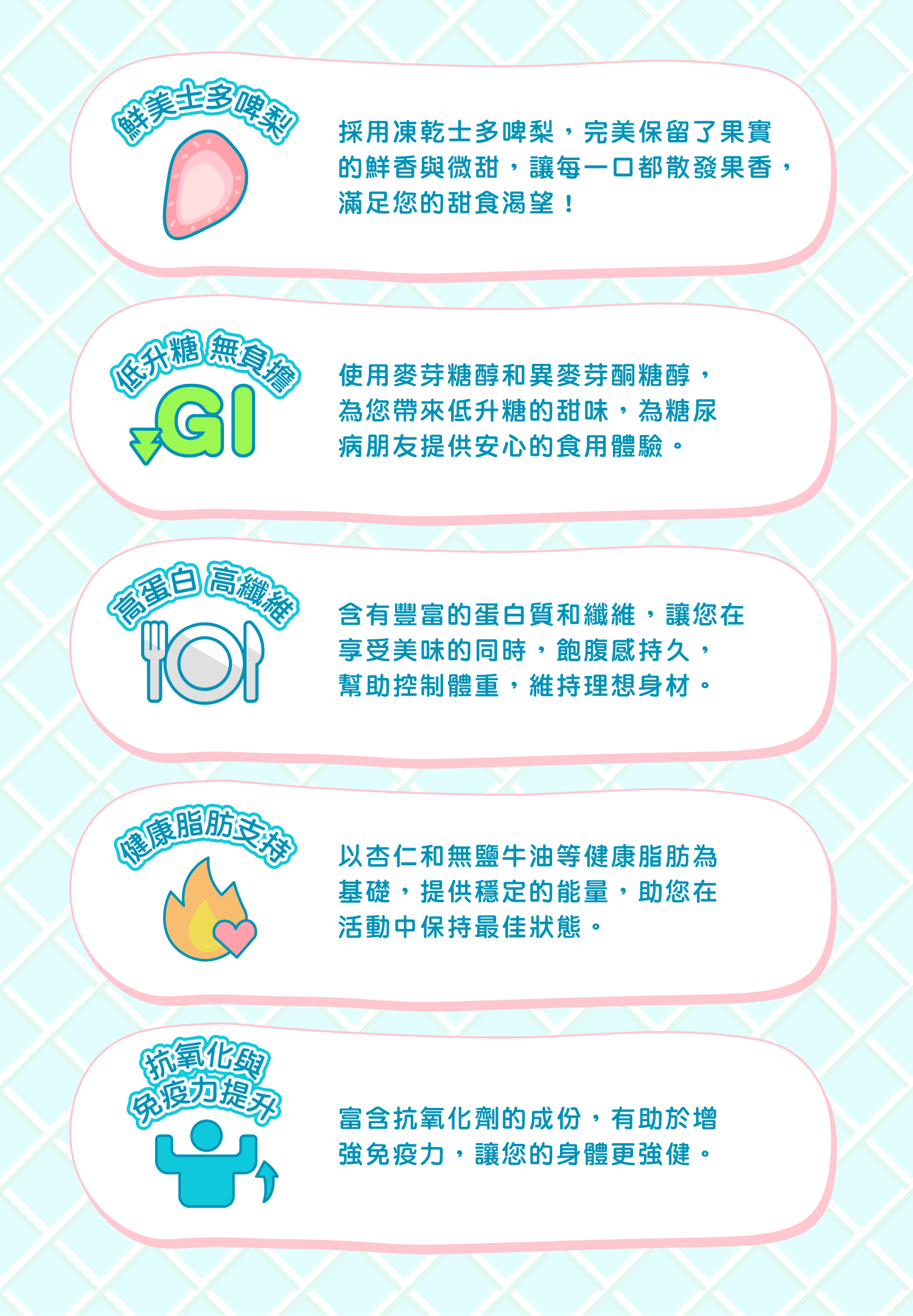 🌰 **低升糖,無負擔**:我們使用麥芽糖醇和異麥芽酮糖醇,為您帶來低升糖的甜味,為糖尿病朋友提供安心的享用。