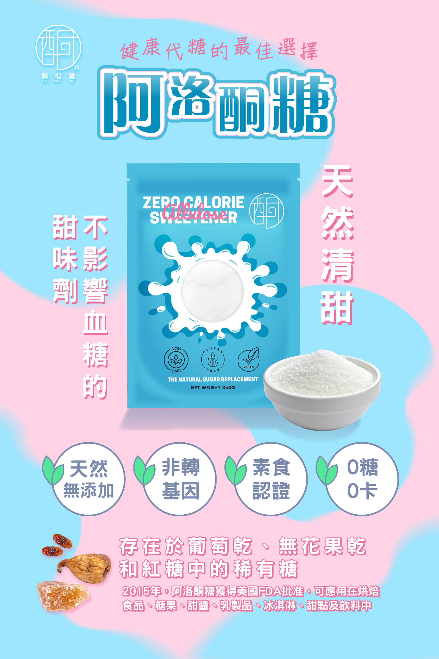 阿洛酮糖是您健康生活的理想選擇,這種天然甜味劑是一種稀有糖,存在於葡萄乾、無花果乾和紅糖中。2015年阿洛酮糖獲得美國FDA批准,可應用在烘焙食品、糖果、甜醬、乳製品、冰淇淋、甜點及飲料中。阿洛酮糖的甜度約為蔗糖的70%,幾乎不含熱量,卻能在各種食品中保留與蔗糖相似的性狀和功能,使其成為健康代糖的最佳選擇。