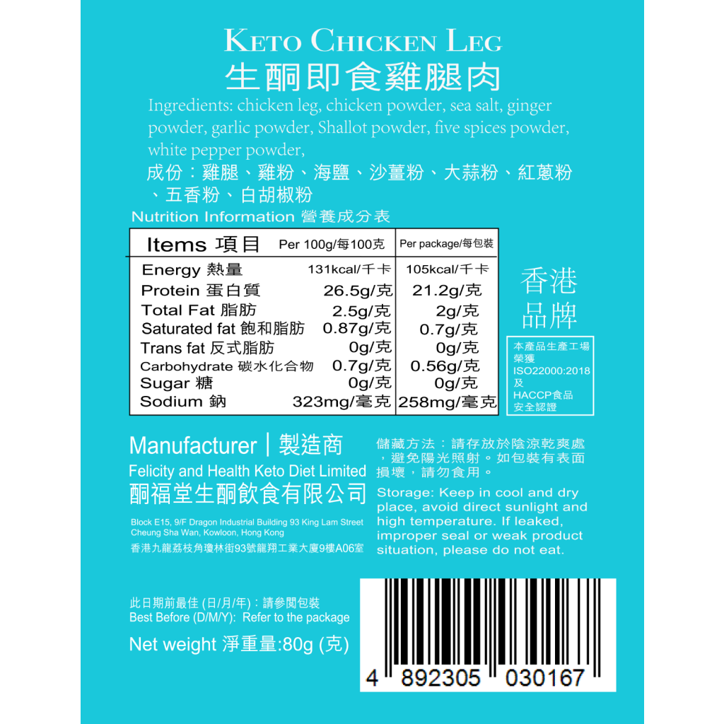 又香又滑的無激素雞腿肉,以無糖無添加配方醃製烤煮,再以高科技無菌包裝技術入袋,製成可以常溫保存既好食又方便保存及攜帶的生酮鹽焗雞腿。對於食雞胸肉食到已經生厭唔想再食嘅健身朋友,由今日開始可以多一個選擇啦~