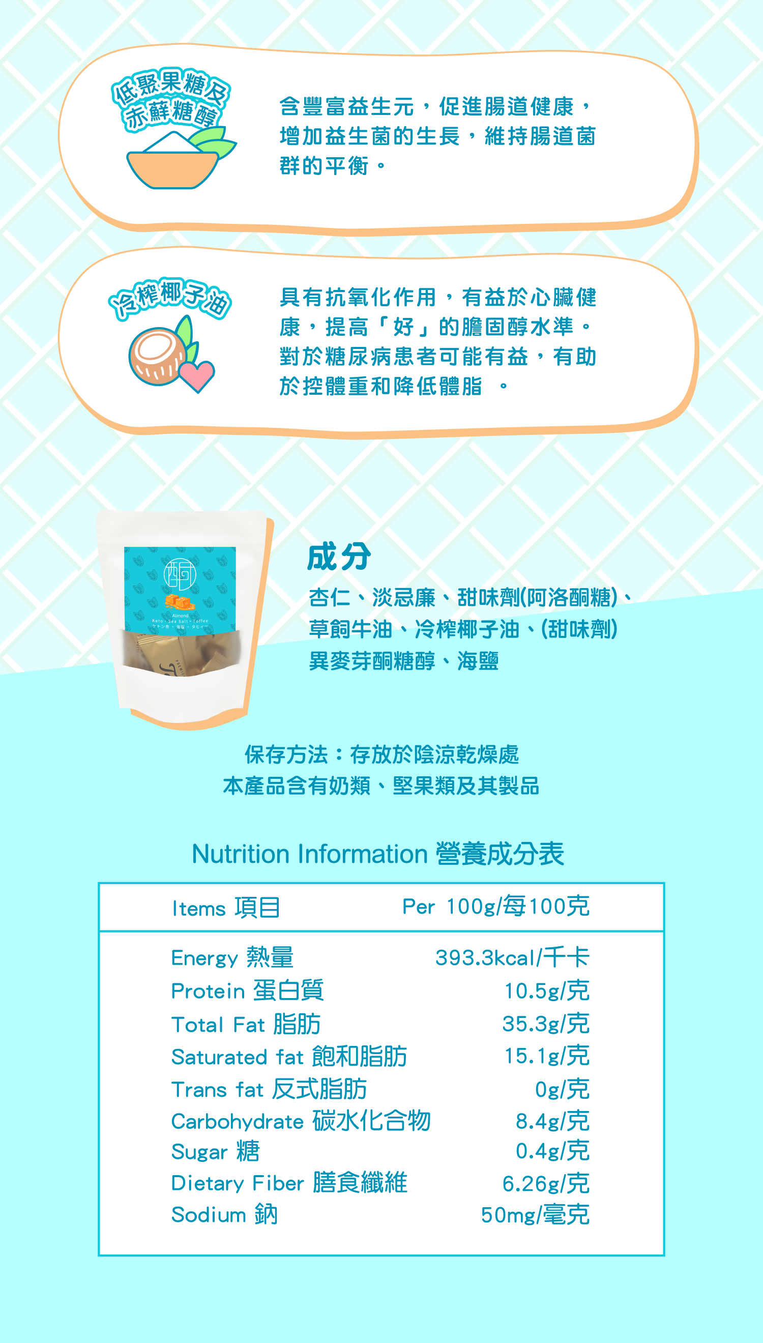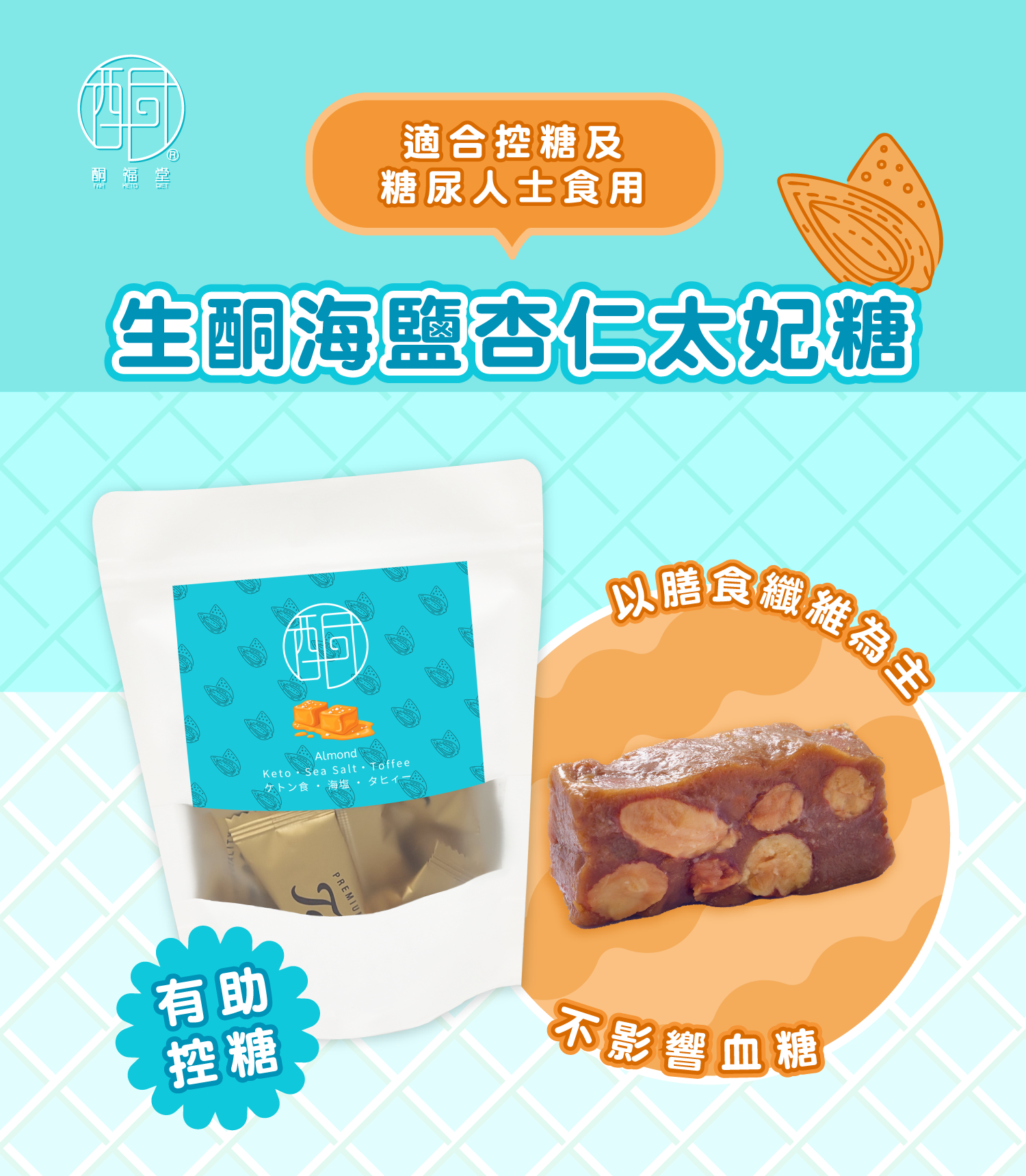 採用優質進口阿洛酮糖,零熱量, 不升糖·不破酮 , 杏仁含優質的植物蛋白質、膳食纖維及脂肪,含糖量極低,營養豐富,有助降血脂、降壞膽固醇及 改善血糖問題。椰子油有助身體產生酮體,改善血糖,而且有抗氧化功能,有助美顏,延緩衰老。