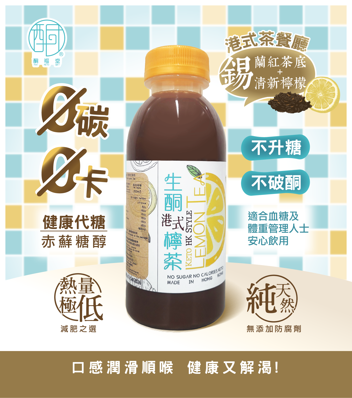 生酮港式檸茶, 源用港式茶餐廳錫蘭茶底加上清新檸檬,配合零碳零卡的健康代糖赤蘚糖醇,口感潤滑順喉,而且不升糖、不破酮,真正健康又解渴,適合有高 血糖問題及怕肥人士安心飲用。採用赤蘚糖醇代替白糖、沿用傳統優質的錫蘭紅茶、既 解渴又不升糖、熱量極低適合減肥人士、純天然無添加防腐劑。