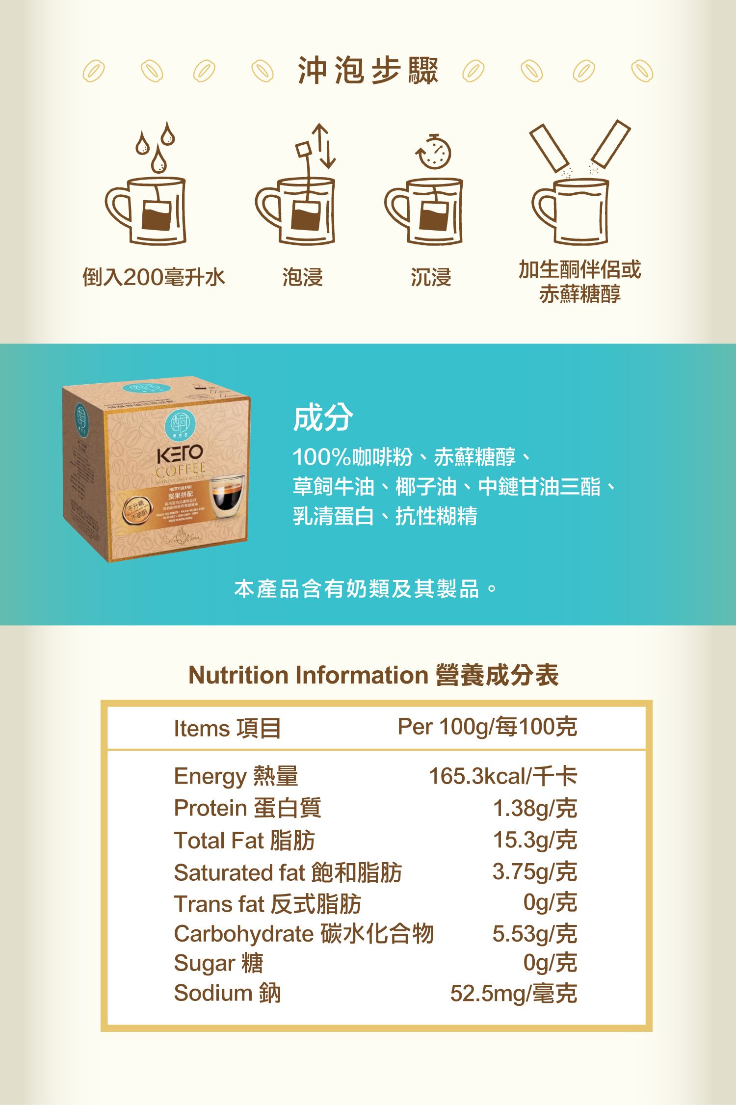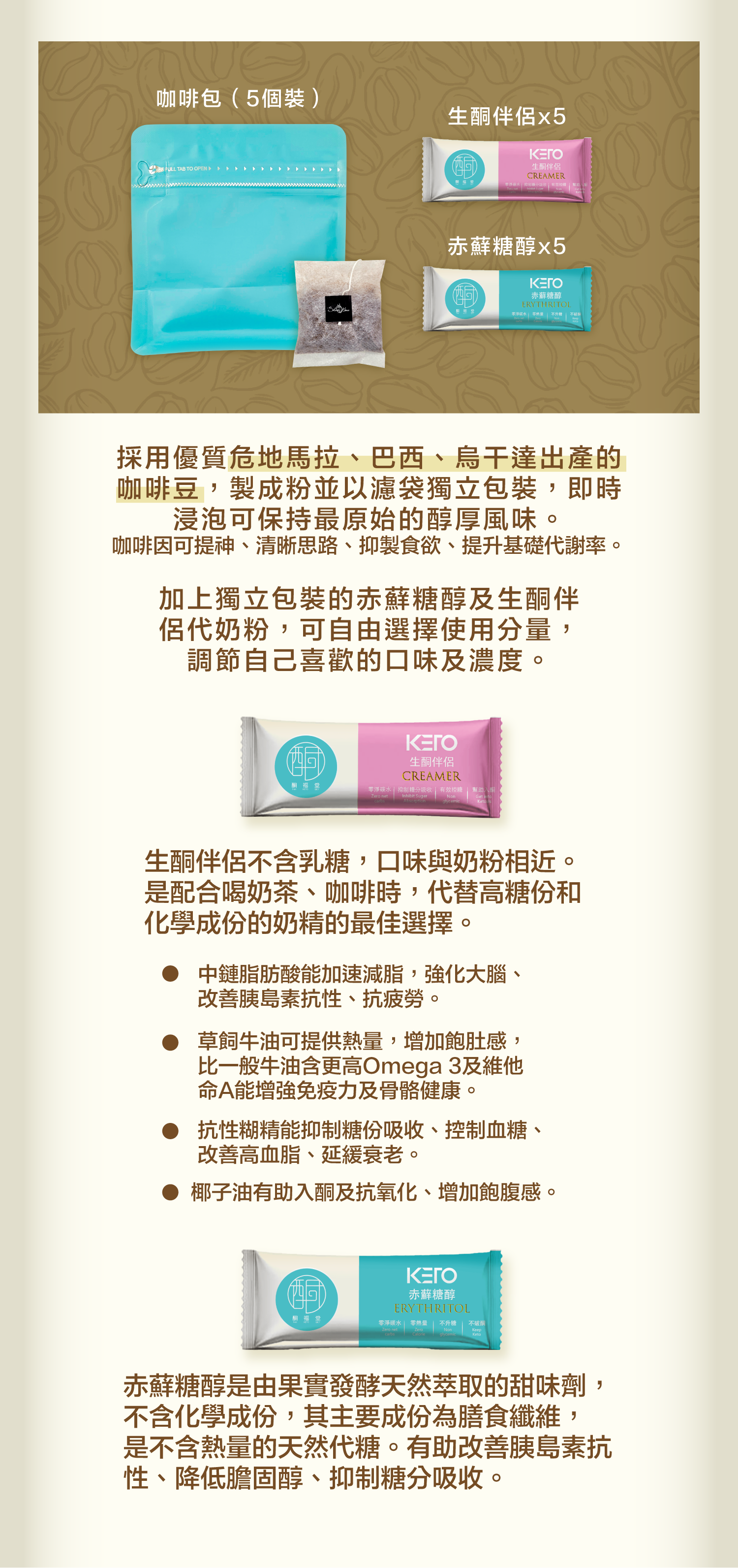 採用優質哥倫比亞、危地馬拉、干達等地出產的咖啡豆,製成粉並以濾袋獨立包裝,即時浸泡可保持最原始的醇厚風味,加上獨立包裝的赤蘚糖醇及生酮伴侶代奶粉,可自由選擇使用分量,調節自己喜歡的口味及濃度。生酮伴侶中含有中鏈脂肪酸能加速減脂、強化大腦、改善胰島素抗性、抗疲勞。草飼牛油可提供熱量、增加 飽肚感、比一般牛油含更高Omega 3及維他命A, 能增強免疫力及骨骼健康。抗性糊精能抑制糖份吸收、控制血糖、改善高血脂、延緩衰老。